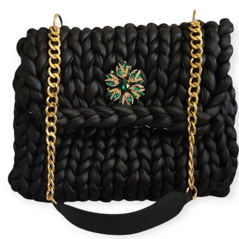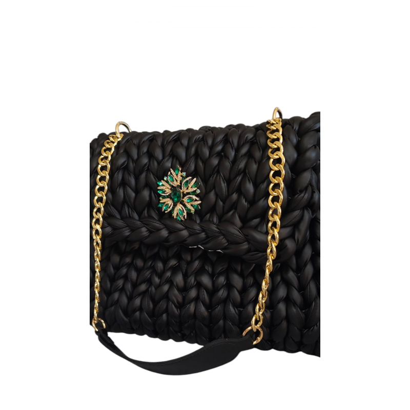 Χειροποίητη, με εντυπωσιακό πλέξιμο, πολυτελή χρυσή αλυσίδα ώμου 70εκ και μοναδικό διακοσμητικό με πράσινες πέτρες που θυμίζει κόσμημα.