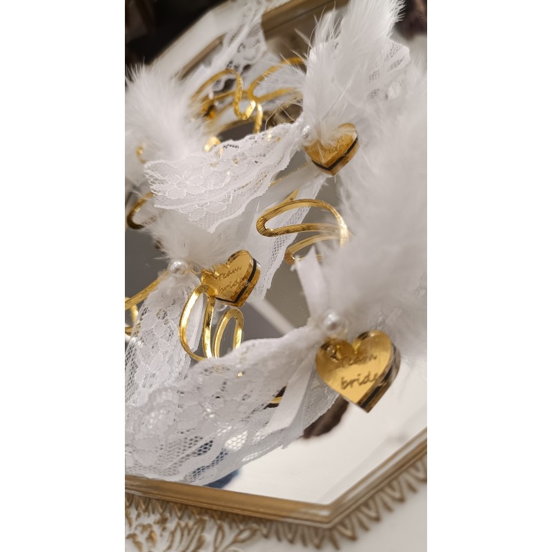 ???? Υλικά: Χρυσή χειροπέδα, λευκή δαντέλα, πέρλα, πούπουλο, πλέξιγκλας με χάραξη