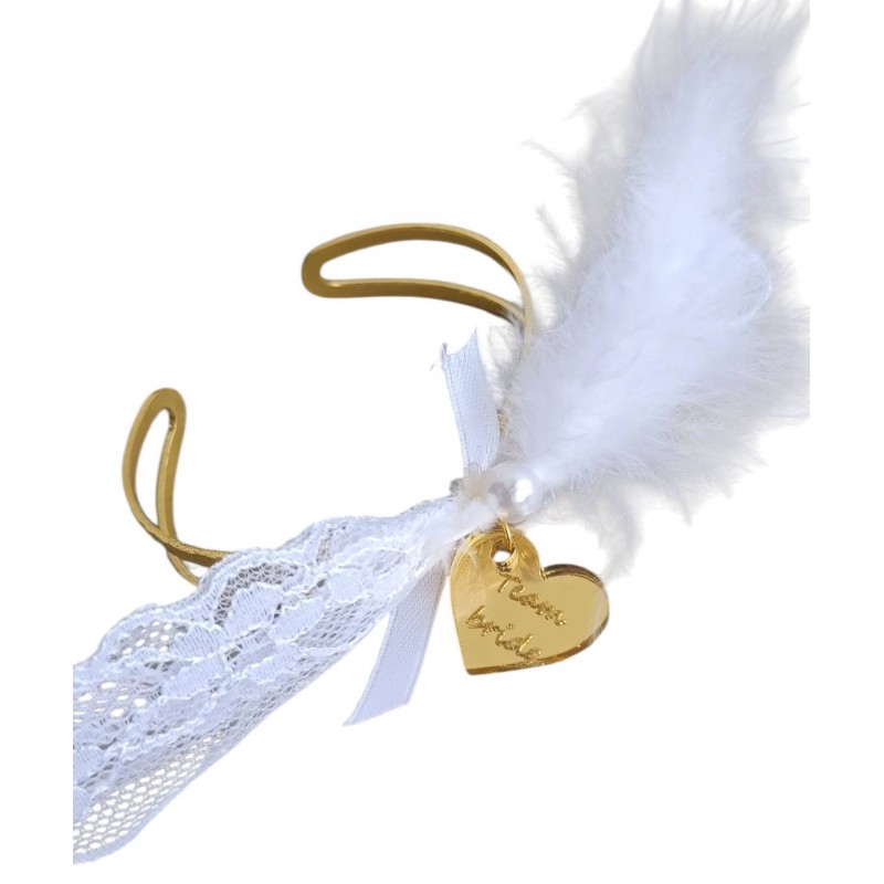 Η χρυσή χειροπέδα δένει αρμονικά με τη λευκή δαντέλα, το ανάλαφρο πούπουλο και την πέρλα, δημιουργώντας ένα ρομαντικό και διαχρονικό κόσμημα.