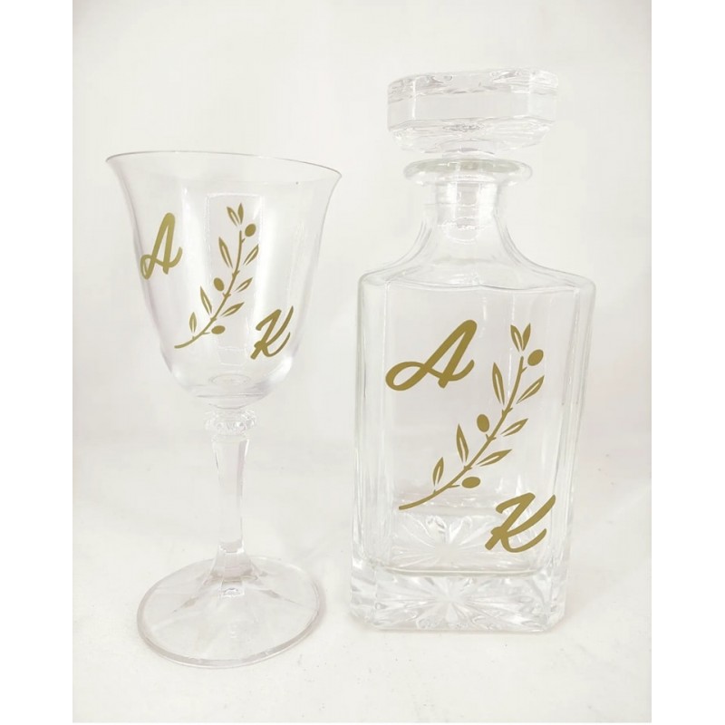 Κρυστάλλινο σετ γάμου, καράφα και ποτήρι με κλαδί ελιάς και μονογράμματα