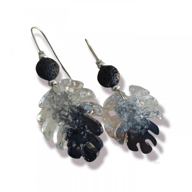 Σκουλαρίκια με ενεργειακό λίθο μαύρη λάβα φύλλα ασημένια και μαύρο σμάλτο