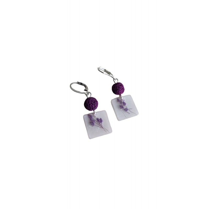 Ετικέτες: Χειροποίητα σκουλαρίκια με μωβ αποξηραμένα λουλούδια, λευκό φόντο και ημιπολύτιμο λίθο μωβ λάβα Ύψος 4, 5 εκ