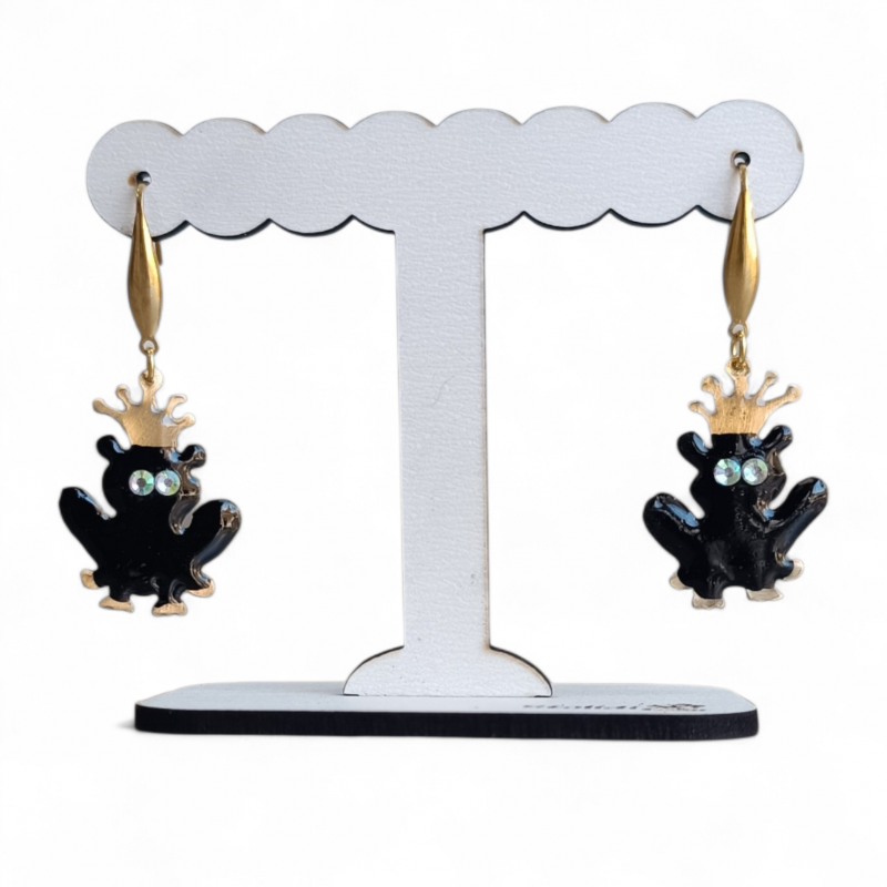 Χαριτωμένα και παιχνιδιάρικα σκουλαρίκια με βατραχάκι και χρυσή κορώνα που τραβούν τα βλέμματα! ????✨ Το μοναδικό τους σχέδιο συνδυάζει μαύρο σμάλτο με λαμπερές λεπτομέρειες και στρας ματιών, δημιουργώντας ένα κόσμημα γεμάτο χαρακτήρα.