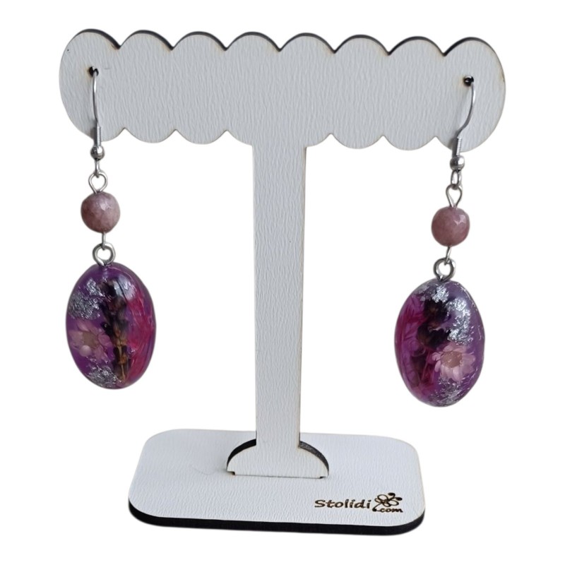 Ετικέτες: Χειροποίητα σκουλαρίκια σε μωβ χρώμα με αληθινά αποξηραμένα λουλούδια Οβάλ σχήμα, ημιπολύτιμο λίθο αχάτη στην κορυφή και γάντζο από ανοξείδωτο ατσάλι Ύψος 5 εκ