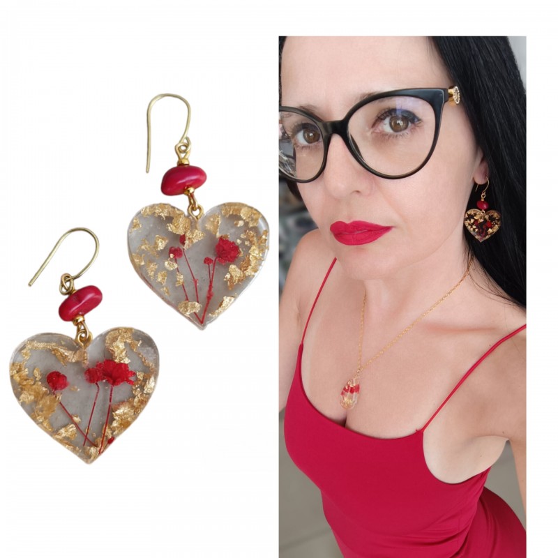 Ετικέτες: Χειροποίητα σκουλαρίκια καρδιά με αληθινά λουλούδια, φύλλα χρυσού και κόκκινο κοράλλι στην κορυφή. Ο γάντζος είναι από σύρμα ορείχαλκου, δεν δημιουργεί αλλεργίες Ύψος μαζί με τον γάντζο 5, 5 εκ
