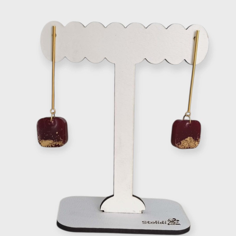 Κομψά μακριά σκουλαρίκια με τετράγωνο στοιχείο από ρητίνη σε βαθύ μπορντό χρώμα και διακριτικές χρυσές λεπτομέρειες.
