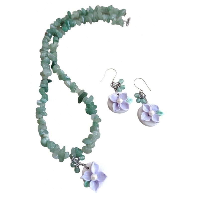 Χειροποίητο κολιέ και σκουλαρίκια με πράσινη αβεντουρίνη και στοιχεία χειροποίητα με λουλουδάκια