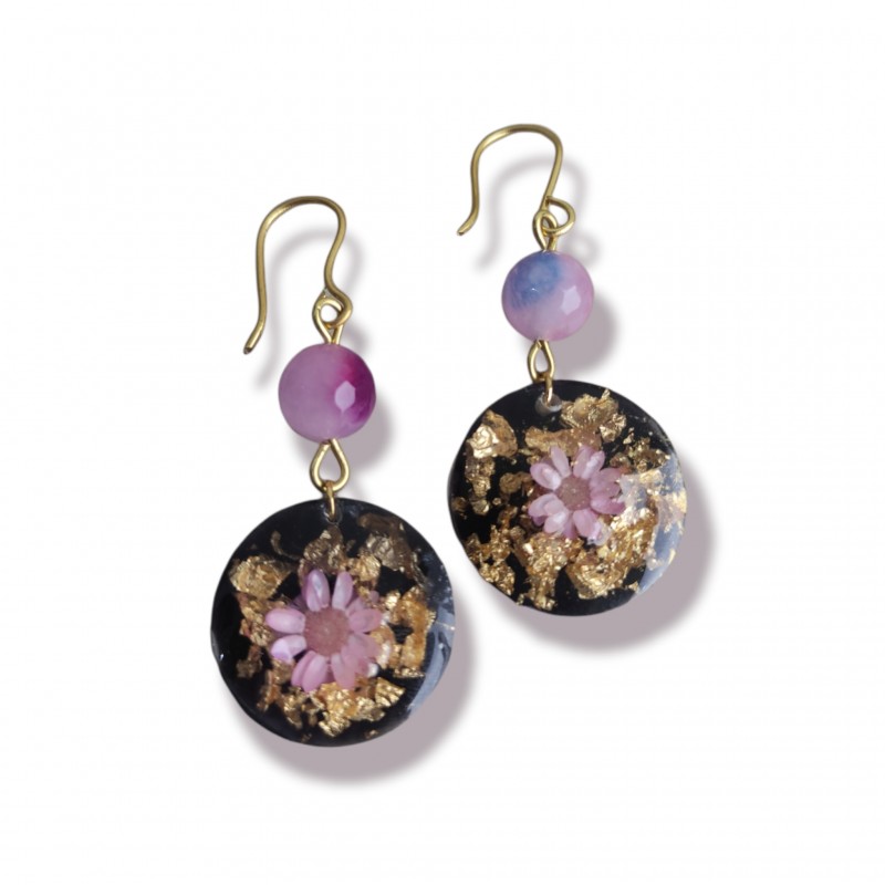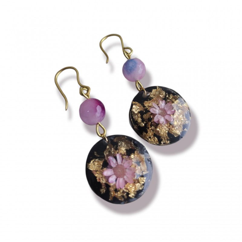 Σκουλαρίκια χειροποίητα με φύλλα χρυσού, αληθινά αποξηραμένα λουλούδια και ενεργειακό κρύσταλλο φθορίτη Σμάλτο στο πίσω μέρος σε μαύρο χρώμα χρώμα Ύψος 5 εκ