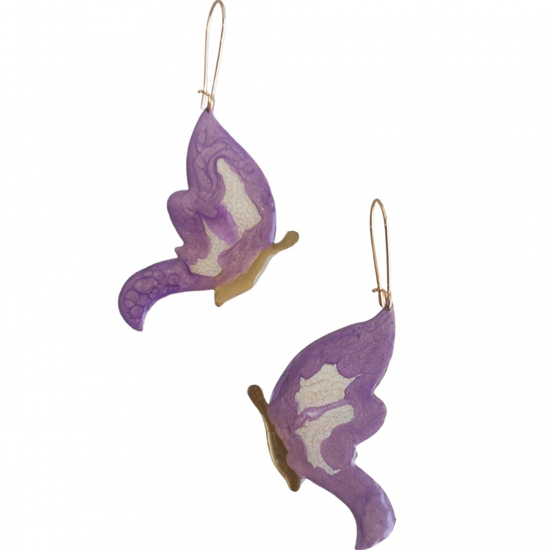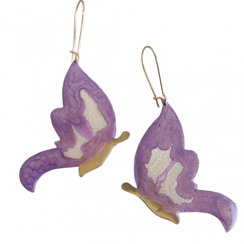 Ετικέτες: Σκουλαρίκια πεταλούδες χειροποίητες από μέταλλο ορείχαλκου βαμμένες με σμάλτο σε μωβ και λευκό χρώμα, Ύψος από τον γάντζο έως κάτω 6, 5εκ Δεν δημιουργούν αλλεργίες