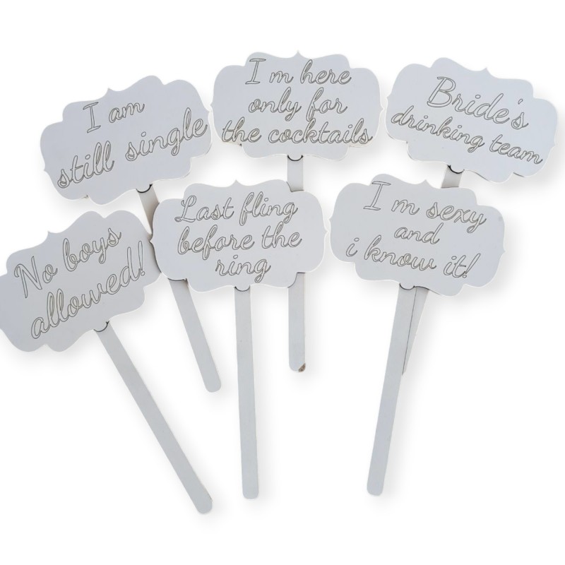 Ετικέτες: Πακέτο που περιλαμβάνει 6 ταμπελάκια με διάφορα μηνύματα Ιδανικά για τις φωτογραφίες την βραδιά του πάρτυ Αν θέλεις να αλλάξεις τα κείμενα στείλε μας μήνυμα