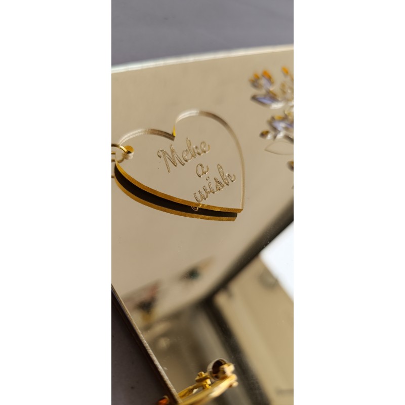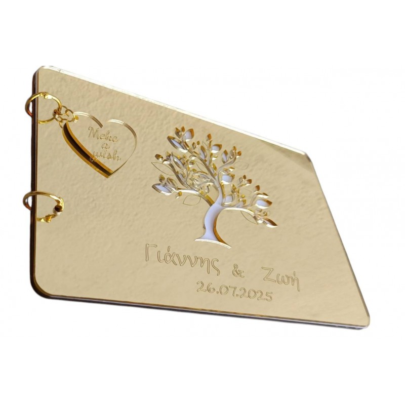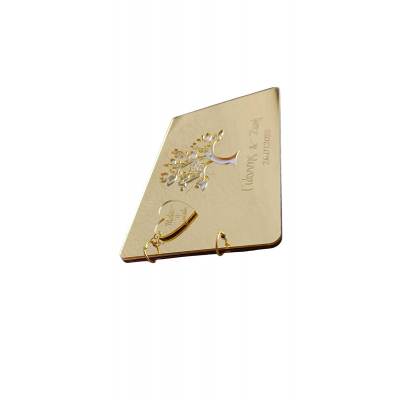 Χειροποίητο, από χρυσό πλεξιγκλάς, που χαράσσεται με τα ονόματά σας και την ημερομηνία του γάμου.Κάθε λεπτομέρεια φτιαγμένη με αγάπη, για να κρατήσει τις πιο όμορφες ευχές των αγαπημένων σας.