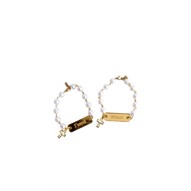 Χειροποίητο Βραχιόλι με πέρλες ροζάριο, πλακέτα χρυσό ή ασημί plexiglass καθρέφτη με χάραξη για το πρόσωπο της επιλογής σας, νονά, μαμά, γιαγιά, θεία, αδερφή, νύφη, κουμπάρα κοκ και στο πλάι κρεμαστό Σταυρουδάκι