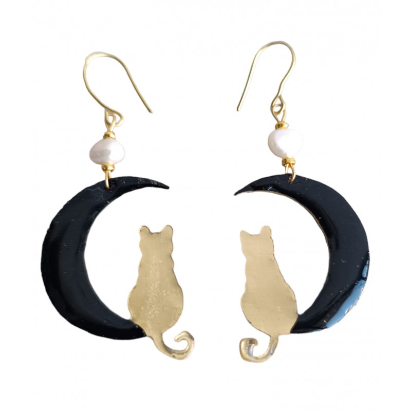 Χειροποίητα σκουλαρίκια γατούλες στο φεγγάρι από μέταλλο ορείχαλκου και μαργαριτάρι στην κορυφή