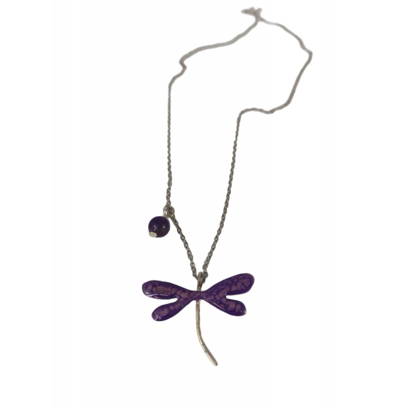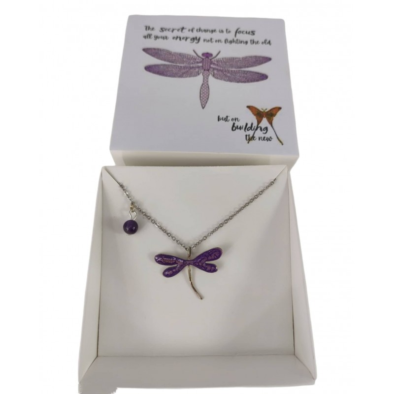 Χειροποίητο κολιέ λιβελούλα με ατσάλινη αλυσίδα και ενεργειακό λίθο αμέθυστο