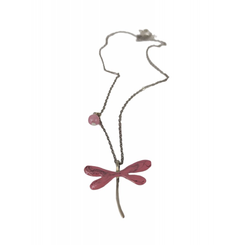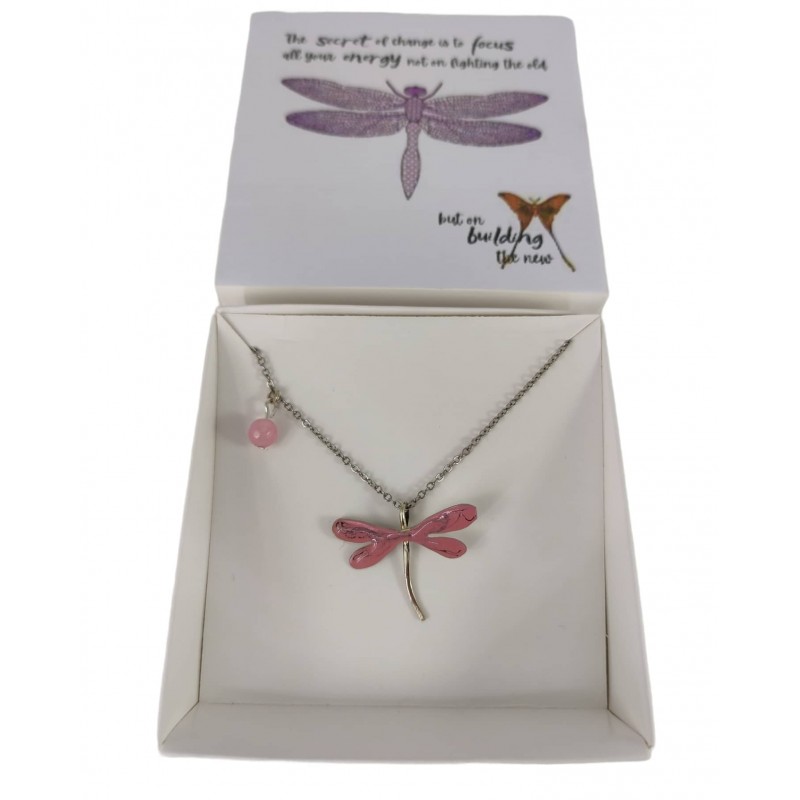 Χειροποίητο κολιέ λιβελούλα με ατσάλινη αλυσίδα και ενεργειακό λίθο ροζ χαλαζία