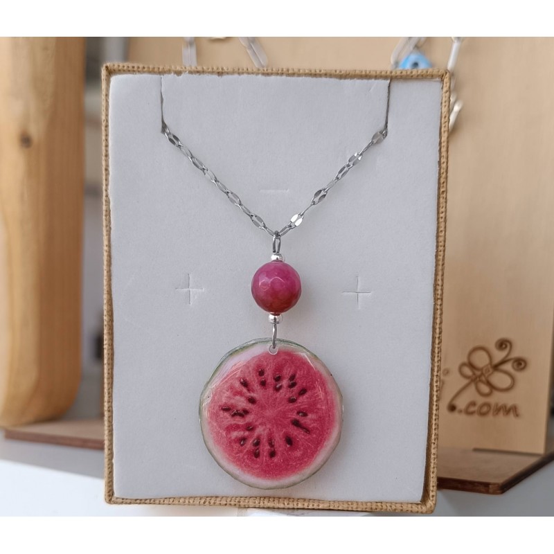 Ετικέτες: Χειροποίητο κολιέ καρπούζι Ημιπολύτιμο λίθο αχάτη στο πάνω μέρος Διάσταση αλυσίδας με την προέκταση 45 εκ Ανοξείδωτο ατσάλι σε ασημένιο χρώμα Διάσταση καρπουζιού 3εκ