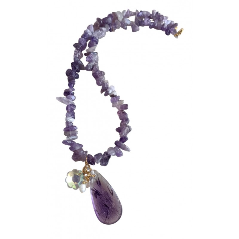 Ετικέτες: Χειροποίητο κολιέ με αμέθυστο και στοιχείο με αληθινά λουλούδια Στο πλάι έχει μαργαριτάρια διάσταση 43 εκ το μωβ στοιχείο με τα αληθινά αποξηραμένα λουλούδια είναι 4 εκ