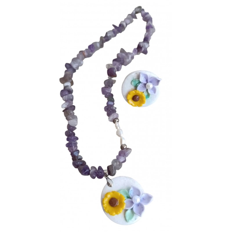 Χειροποίητο Κολιέ  με αμέθυστο και στοιχείο χειροποίητο με λουλουδάκια σε κίτρινο και μωβ