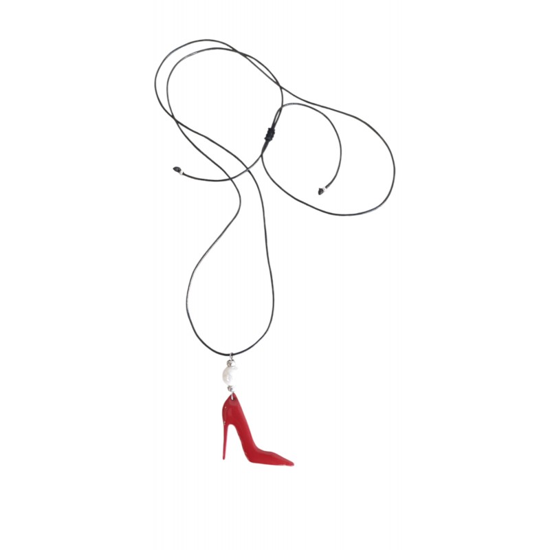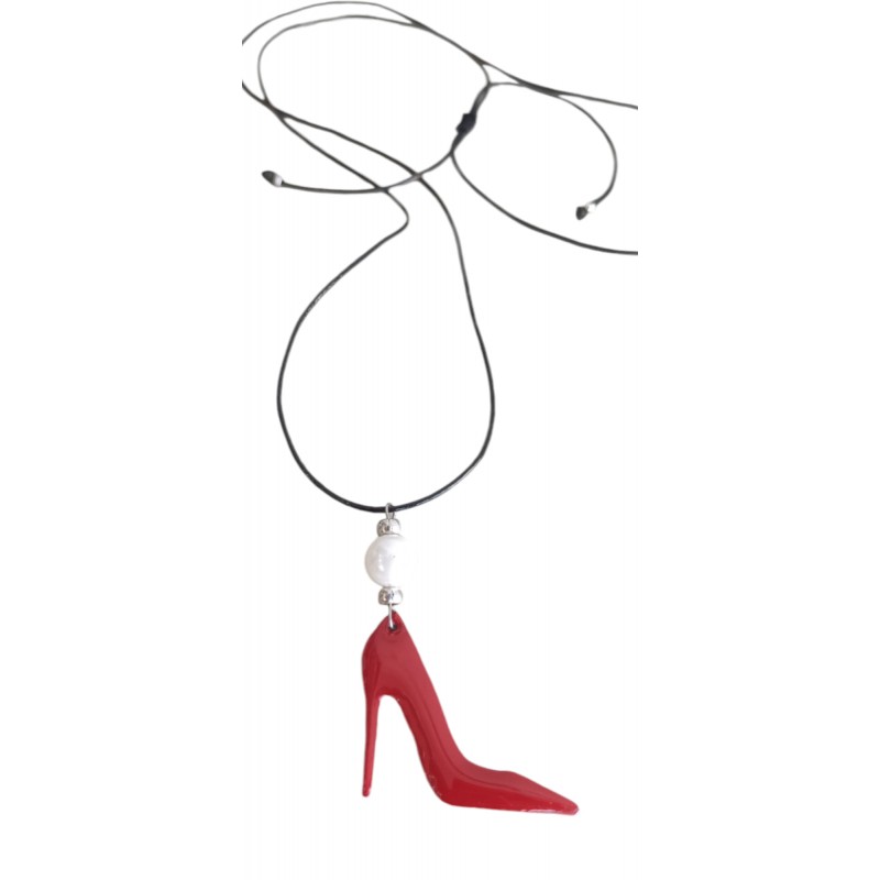 Ετικέτες: Χειροποίητο κολιέ με μαύρο δερμάτινο κορδόνι, το μέγεθος του οποίου αυξομειώνεται Κόκκινη γόβα με μαργαριτάρι στην κορυφή Μέγεθος μενταγιόν μαζί με το μαργαριτάρι 6 εκ