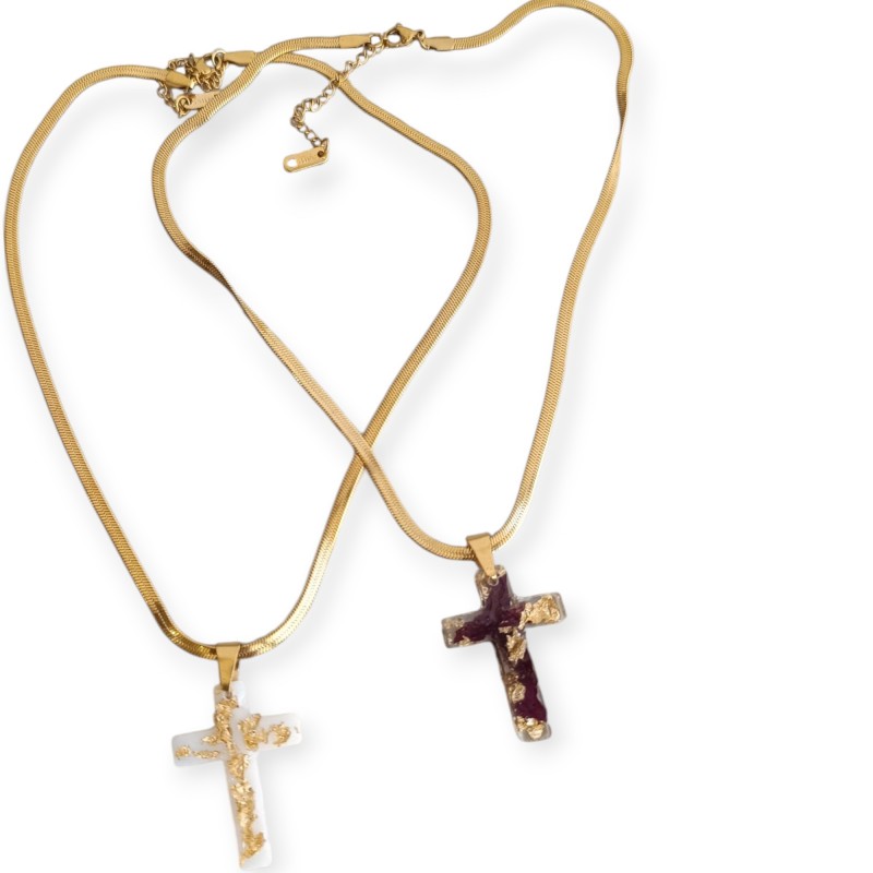 Ετικέτες: Χειροποίητα Σταυρουδάκια με snake αλυσίδα από ανοξείδωτο ατσάλι Δύο σχέδια Ο ένας είναι λευκός με φύλλα χρυσού και ο δεύτερο με φύλλα χρυσού και τριαντάφυλλο Η αλυσίδα είναι 45 εκ με την προέκταση και τα Σταυρουδάκια είναι 3, 5Χ2, 5 εκ