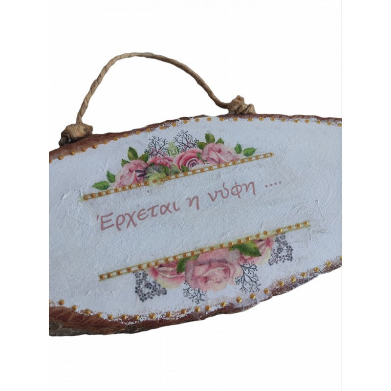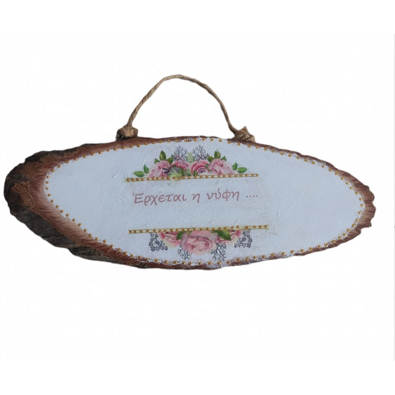Ετικέτες: Ξύλινη πινακίδα, κορμός δέντρου " Έρχεται η νύφη". Διάσταση 38Χ18 εκ