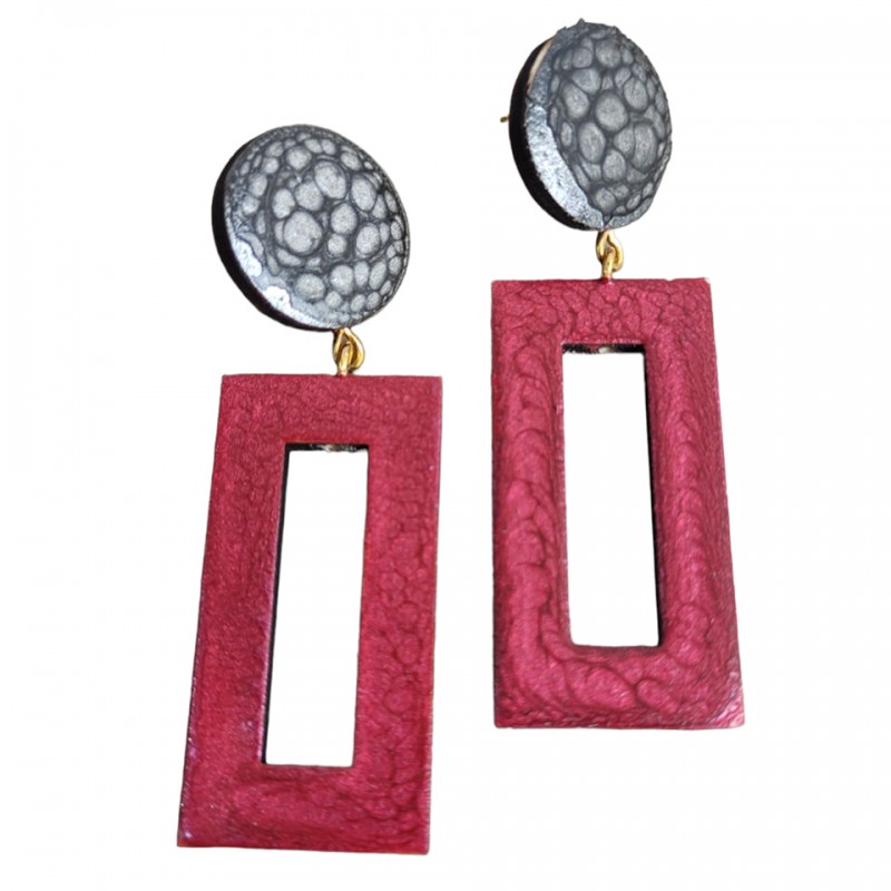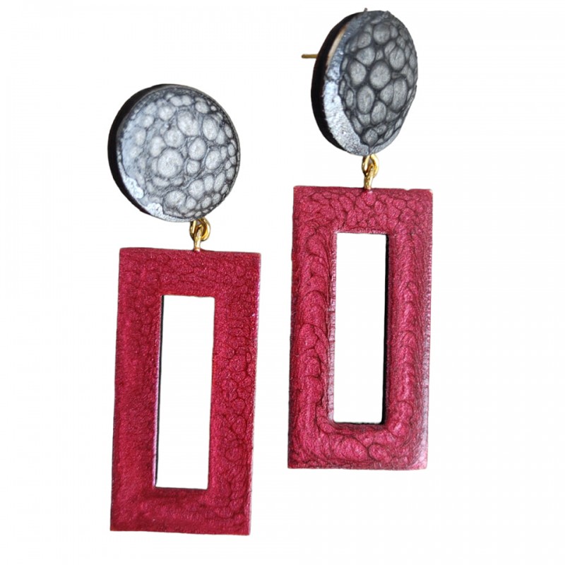 Ξύλινα χειροποίητα σκουλαρίκια σε μπορντό με γκρι χρώμα, Διάσταση 7Χ2 εκατοστά