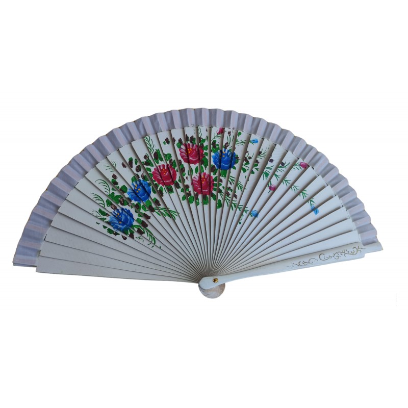 Ξύλινη μεγάλη  βεντάλια λευκή με ζωγραφισμένα λουλούδια