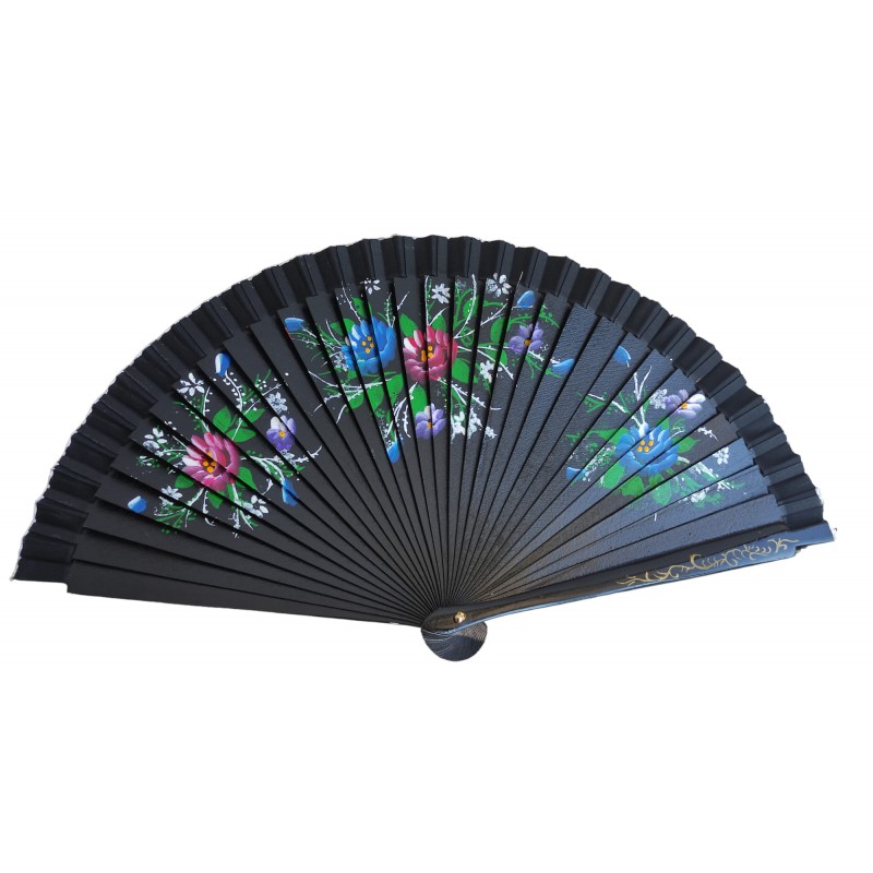 Ξύλινη μεγάλη βεντάλια μαύρο χρώμα με ζωγραφισμένα λουλούδια
