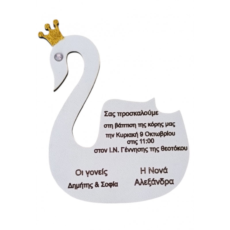 Ετικέτες: Ξύλινο προσκλητήριο βάπτισης, κύκνος Με το δικό σας μήνυμα χαραγμένο Γκλίτερ χρυσό στην κορώνα και στρας στο μάτι Διάσταση 12Χ9 εκ